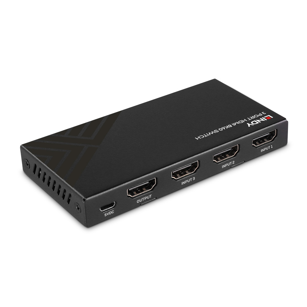 The Lindy 3 Port HDMI® 8K60 switch is a compact, high quality solution for effortlessly switching between 3 HDMI® source devices when connected to a single display.