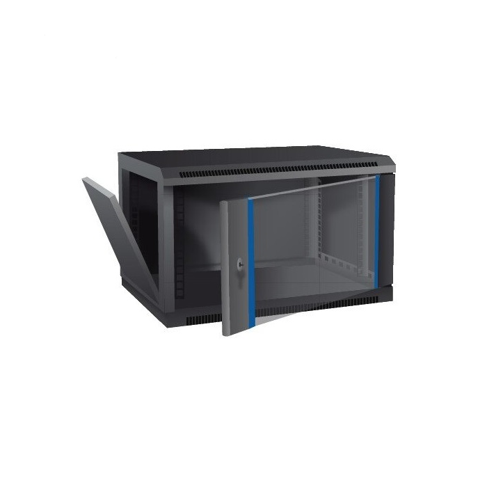 19″ sienas skapis ar priekšējām stikla durvīm un noņemamiem un slēdzamām durvīm un sāniem. Kabeļu ievadi apakšā un jumtā.